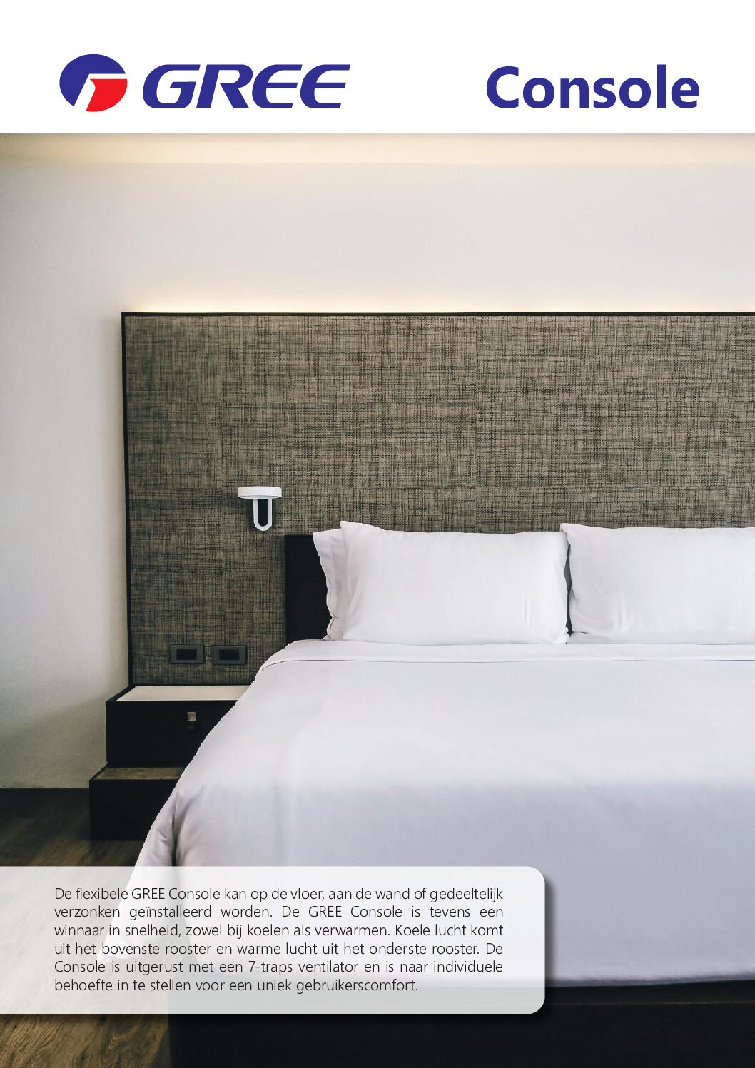 De Gree Vloermodel  is ontworpen om naadloos in uw interieur te integreren. De unit wordt laag aan de muur geplaatst, vergelijkbaar met een radiator, waardoor hij minder opvalt dan traditionele wandmodellen. Dit maakt hem perfect voor woonkamers, slaapkamers, kantoren of andere ruimtes waar een subtiele uitstraling gewenst is.